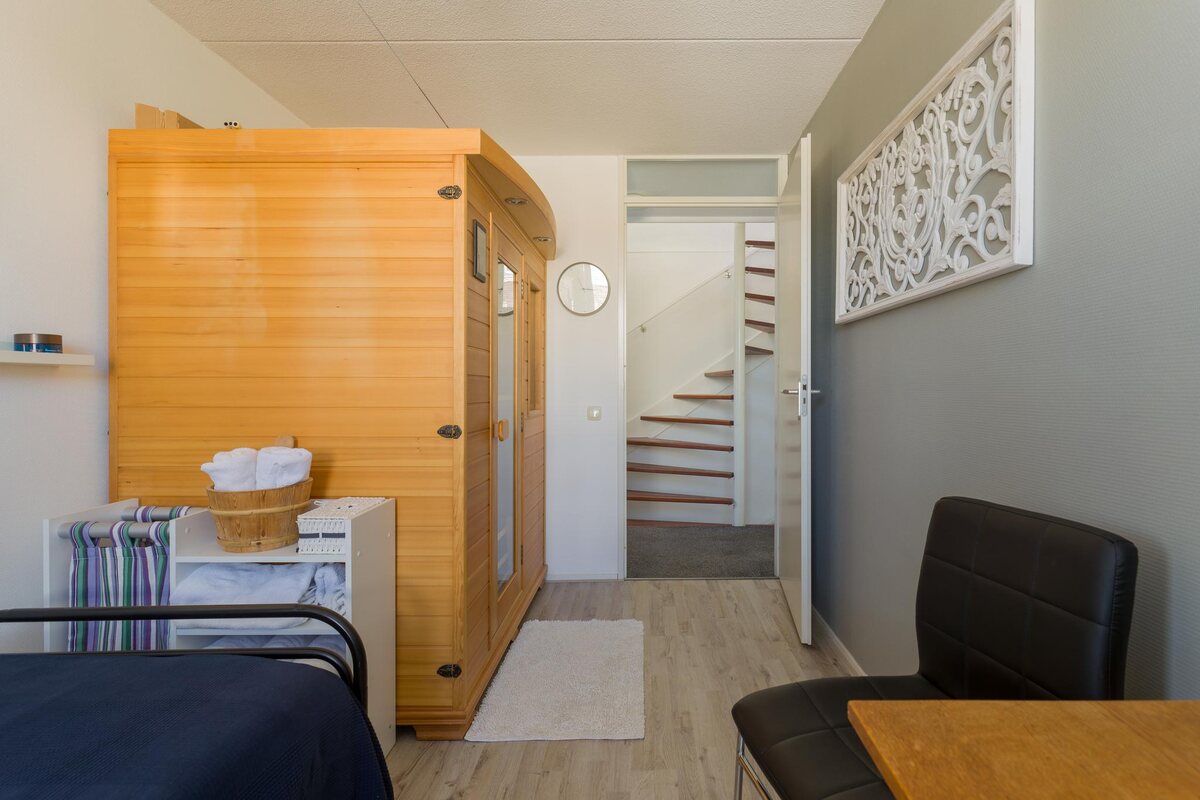 2e verdieping: overloop met veel bergruimte, o.a. in een handige bergkast, dakraam, binnenunit van de warmtepomp en twee grote boilers.Ruime en leuke zolderslaapkamer (ca. 14 m2) met dakramen en heel veel bergruimte achter de knieschotten.