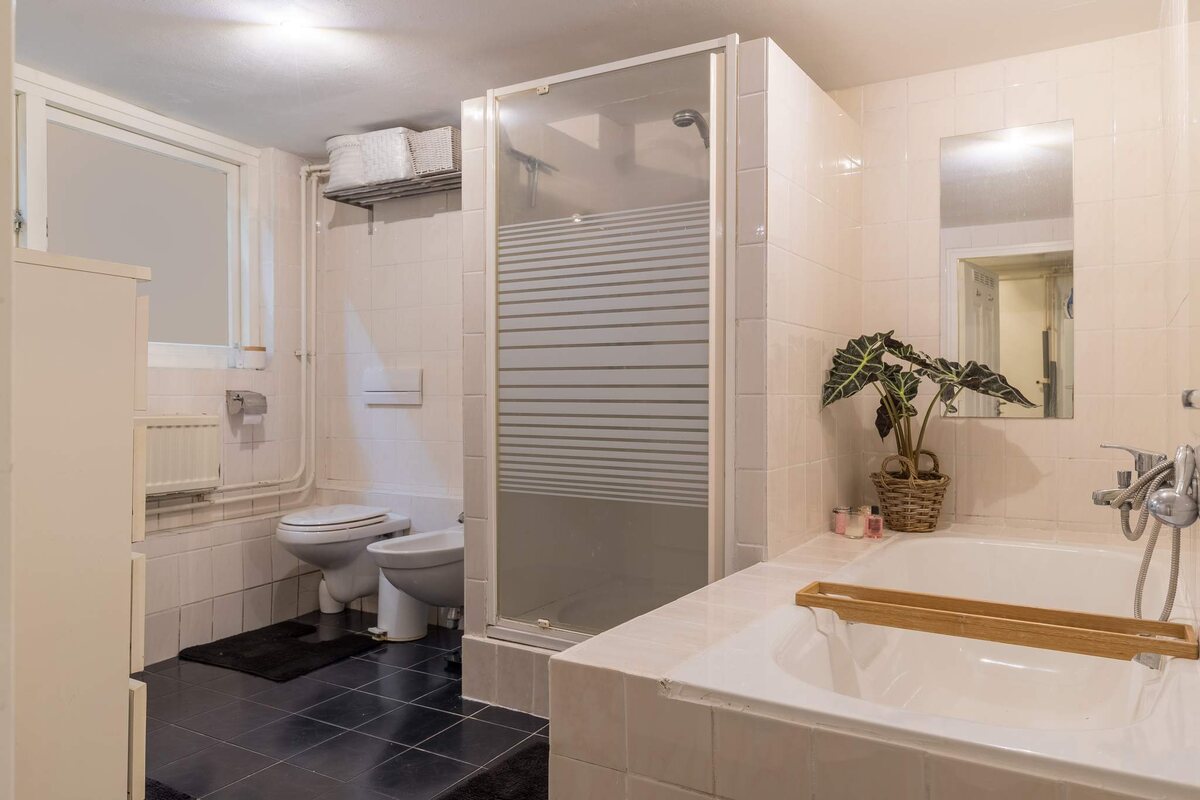Begane grond/souterrain: entree in halletje met hoog plafond, twee traptreden omlaag naar gang over de volle lengte. Aan de voorzijde een prachtige slaapkamer van 22 m2 met ingebouwde kasten (stahoogte 1.93 m). Aan de achterzijde een flinke badkamer (9 m2) met ligbad, aparte douche, toilet en bidet. Achter de badkamer een buitenplaatsje (met daarboven dakterras) voor fietsen en opslagruimte.Eerste verdieping: ruime woonkamer met sfeer (40 m2) en open haard en een plafondhoogte van 3,10 m. Nette open woonkeuken met apart deel voor eettafel. Schuifdeur naar zonnig dakterras op het westen (15 m2).Tweede verdieping: overloop met ingebouwde kasten en kleine berging. Twee slaapkamers van 13 en 10 m2 (bruto vloeroppervlak), beide met ingebouwde kasten.