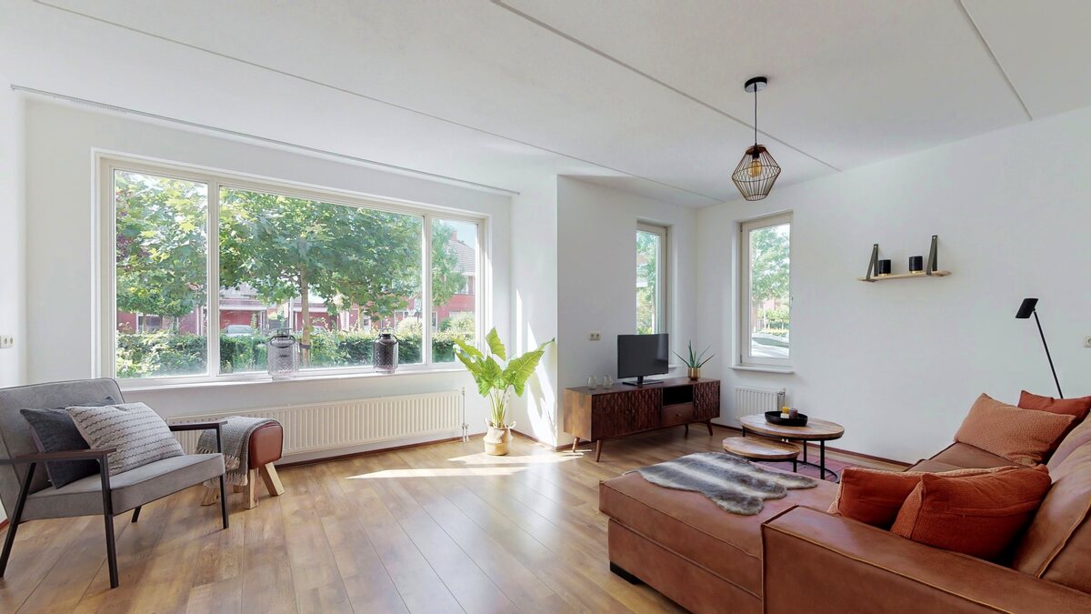 Lichte woonkamer met erker (totaal ca. 30 m2) aan de voorzijde en een ruime woonkeuken (hoekopstelling, ca. 19m2) met openslaande deuren naar de tuin en doorloop naar de bijkeuken. Ruime bijkeuken (ca. 7,5 m2) met opstelplaats voor de wasmachine. Binnendoor naar de garage.Verdieping: De bovenverdieping heeft drie slaapkamers. Slaapkamers 1 en 2 (ca. 13 en 9 m2) zijn gelegen aan de straatzijde waarvan één een dubbele loopdeur heeft naar een buitenruimte van ca. 3.5m x 80 cm. Slaapkamer 3 (ca. 11 m2) ligt aan de achterzijde van de woning evenals de ruime badkamer (7,5 m2) met ligbad, separate douche, toilet en wastafel.Tweede verdieping: middels een vaste trap is een royale bergzolder van ca 25 m2 bereikbaar. Deze heeft de mogelijkheid tot het realiseren van een 4e slaap/werkkamer.
